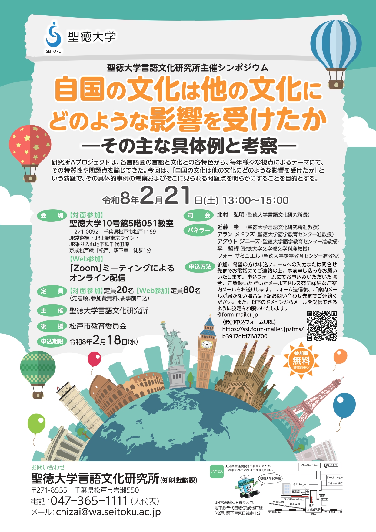 聖徳大学言語文化研究所主催シンポジウム「自国の文化は他の文化にどのような影響を受けたか ―その主な具体例と考察―」を開催します(2/21)