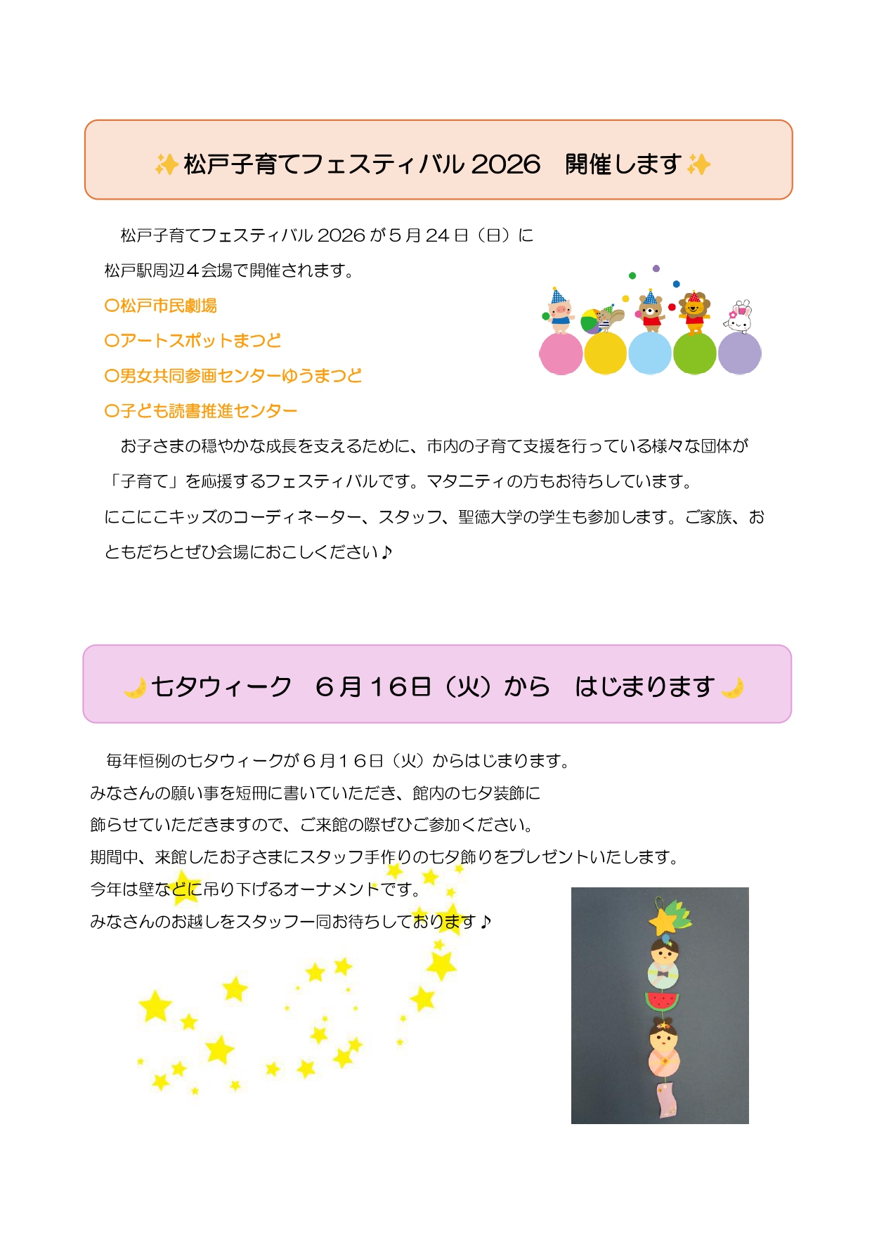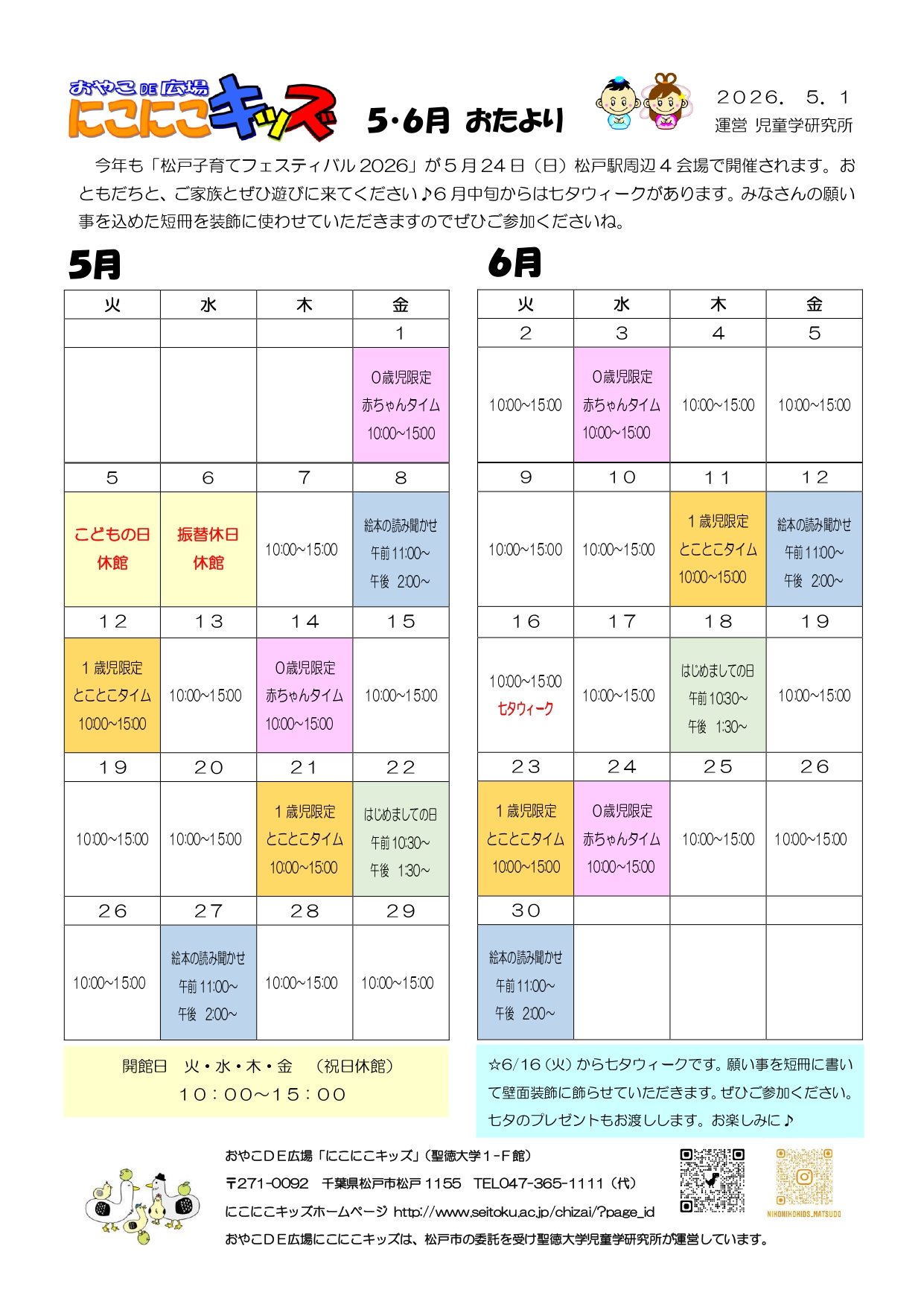 【おやこDE広場にこにこキッズ】お便り(2026年5月・6月号)アップしました! 投稿日: 2026年4月21日 2026年4月21日 投稿者: chizai カテゴリー: おやこDE広場にこにこキッズ タグ: お便り, にこにこキッズ おやこDE広場にこにこキッズ 2026年 5月・6月のおたよりをアップしました! 画像をクリックするとPDFファイルが開きます。 投稿ナビゲーション 前 過去の投稿: ※終了しました(4/15)※【にこにこキッズ】こいのぼりウィークプレゼントのお知らせ🎏(4/7~) chizai 1054RSS