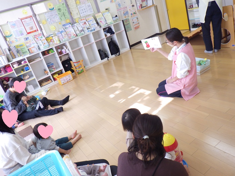 今回はクリスマスをテーマにして「サンタが街にやってくる」のリズム遊びをしたり、クリスマスにちなんだ絵本で「これは何かな?」とあてっこをしたりして楽しみ、元気に答えてくれました。