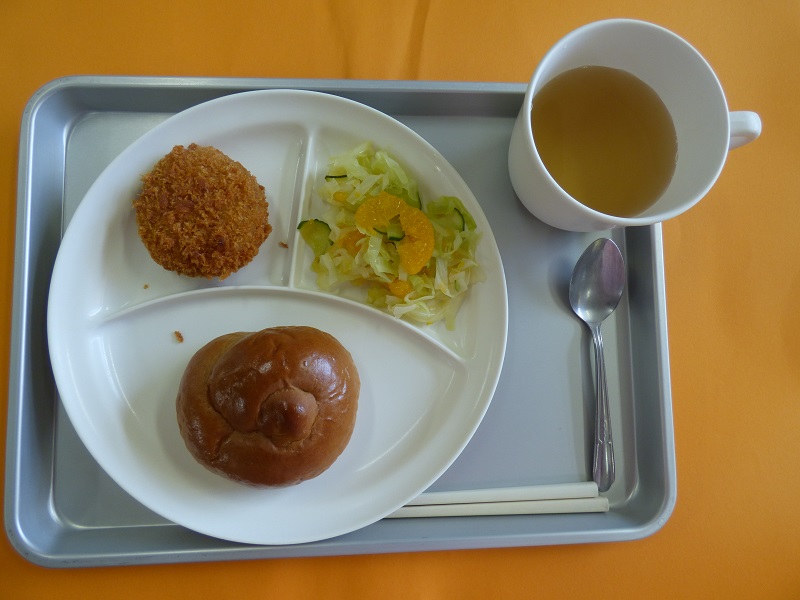 ・黒糖パン、メンチカツ、みかんサラダ、麦茶・・・エネルギー 347Kcal / たんぱく質 11.3g