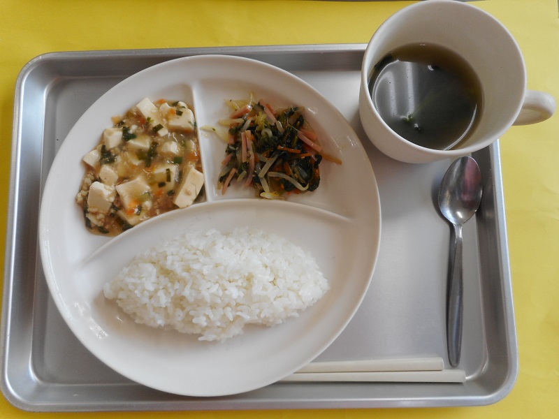 ・ご飯、麻婆豆腐、ポパイサラダ、かまぼこスープ・・・エネルギー 414Kcal / たんぱく質 12.1g