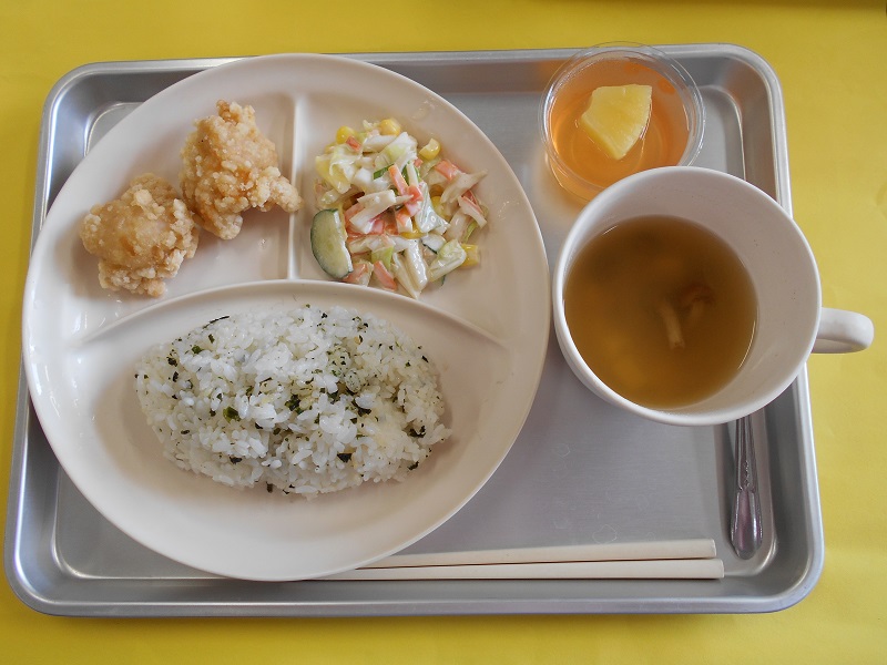・わかめご飯、から揚げ、千草サラダ、なめこの味噌汁、オレンジゼリー・・・・エネルギー 399Kcal / たんぱく質 12.9g