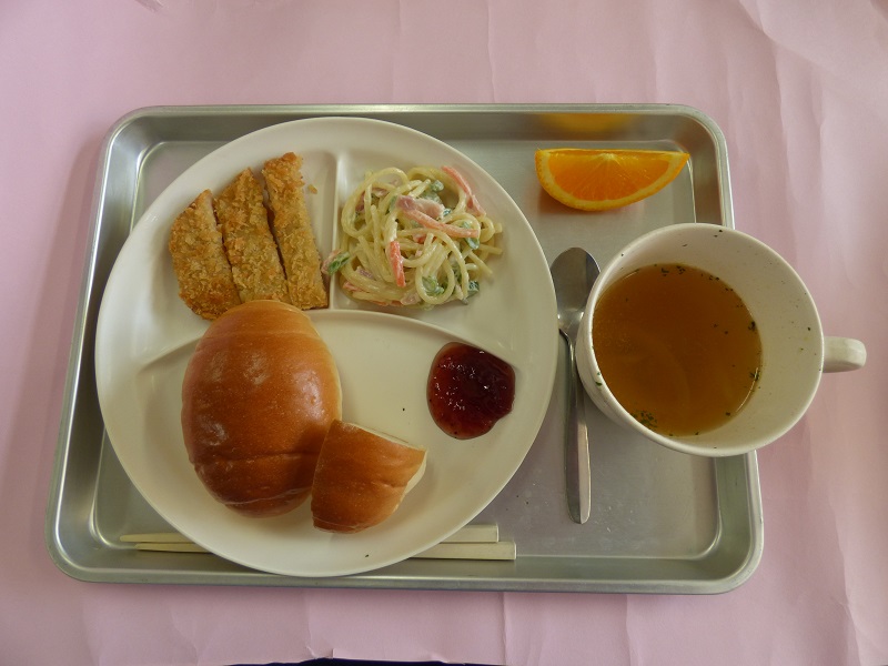 2021.03.12 ★3月15日(月)・16日(火)の献立★(写真付・・・令和2年度給食終了) ★3月15日(月) ・ロールパン、イチゴジャム、ポークフライ、パスタサラダ、オニオンスープ・・・エネルギー 461Kcal / たんぱく質 12.3g ★3月16日(火) ・チキンカレー、ウィンナーソテー、フルーツヨーグルトサラダ、りんごジュース・・・エネルギー 456Kcal / たんぱく質 13.3g ★年長組の特別デザート・・・年長組の卒園をお祝いして「かぼちゃババロア」