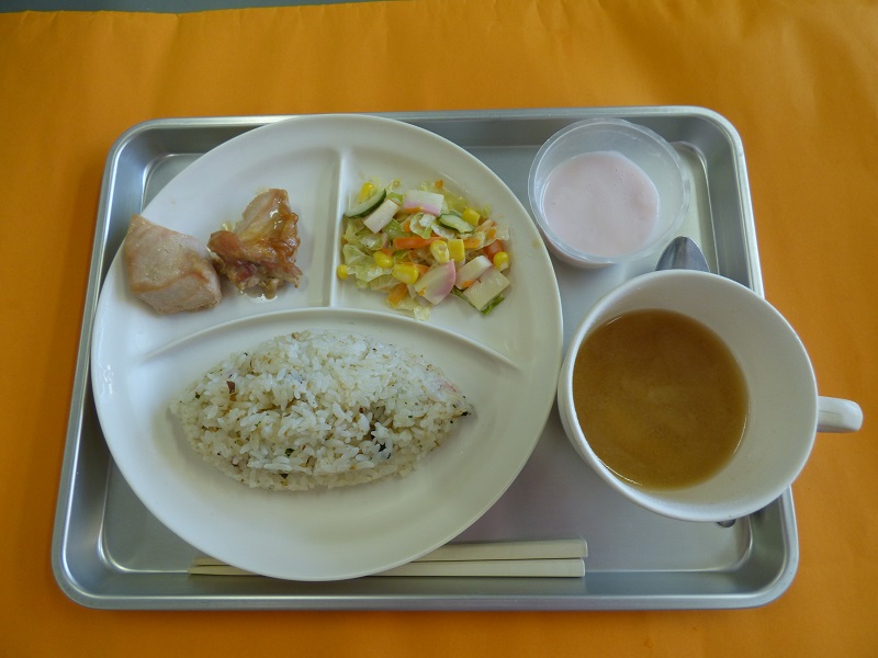 ・おかか若布ご飯、鶏の照り焼き、千草サラダ、大根の味噌汁、フルーチェ・・・エネルギー 384Kcal / たんぱく質 13.9g