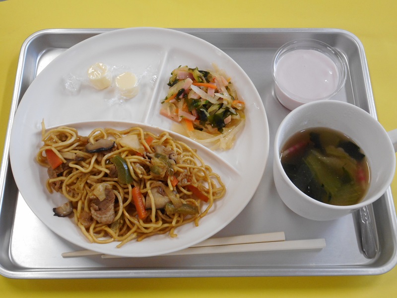 ・焼きそば、チーズ、大根サラダ、青梗菜のスープ、フルーチェ・・・エネルギー 420Kcal / たんぱく質 14.6g