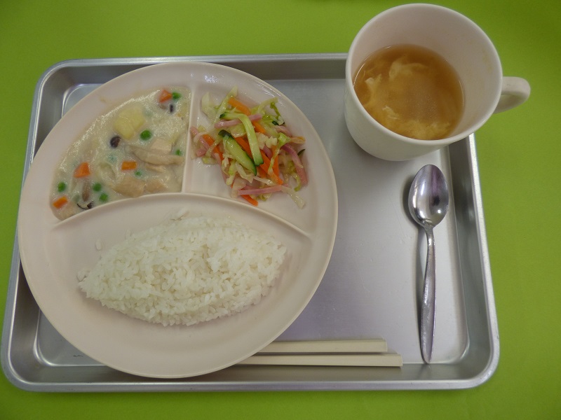 ・ご飯、鶏肉としめじのクリーム煮、千切り野菜のサラダ、洋風卵スープ・・・エネルギー 445Kcal / たんぱく質 13.7g