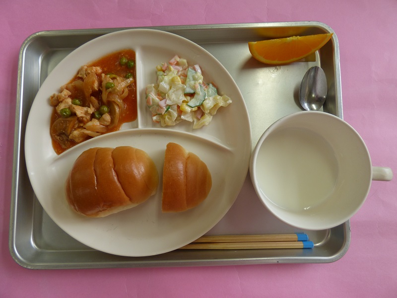 ・バターロールパン、チキンのトマト煮、メキシカンサラダ、ミルク、オレンジ・・・エネルギー 391Kcal / たんぱく質 17.3g