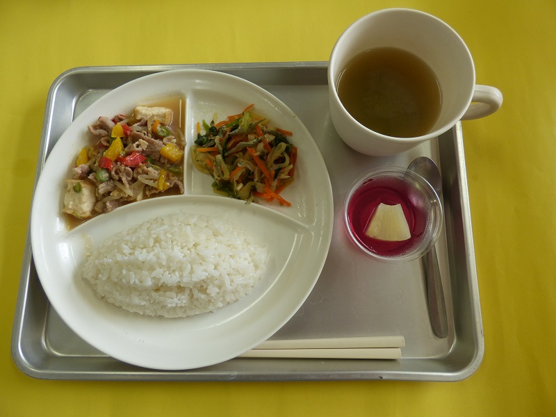 ・ご飯、豚肉の味噌炒め、ジャコサラダ、小松菜のスープ、ぶどうゼリー・・・エネルギー 435Kcal / たんぱく質 15.2g