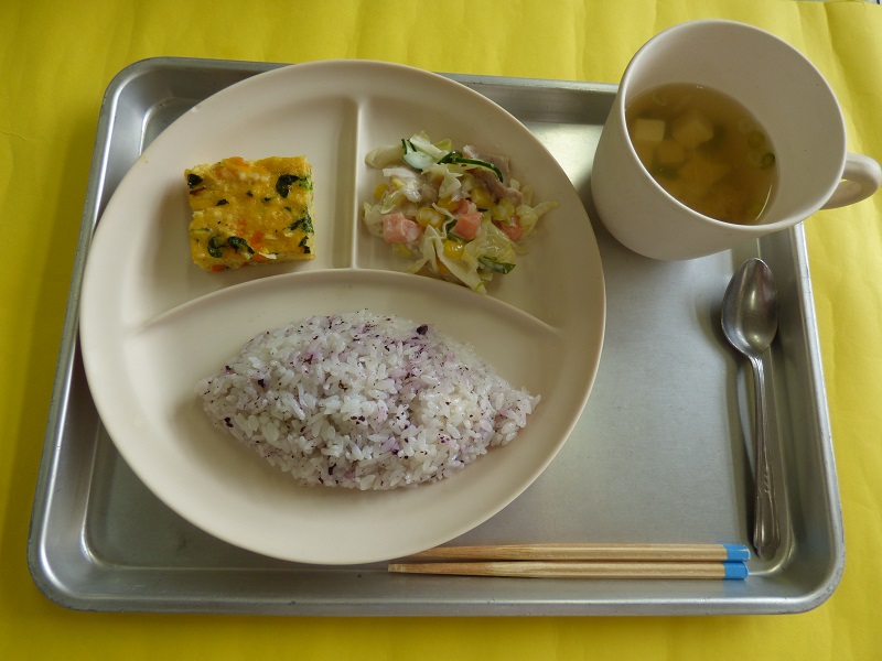 ・お花畑ご飯、ぶりの照り焼き、和風春雨サラダ、じゃがいもの味噌汁、ぶどうゼリー・・・エネルギー 407Kcal / たんぱく質 15.6g
