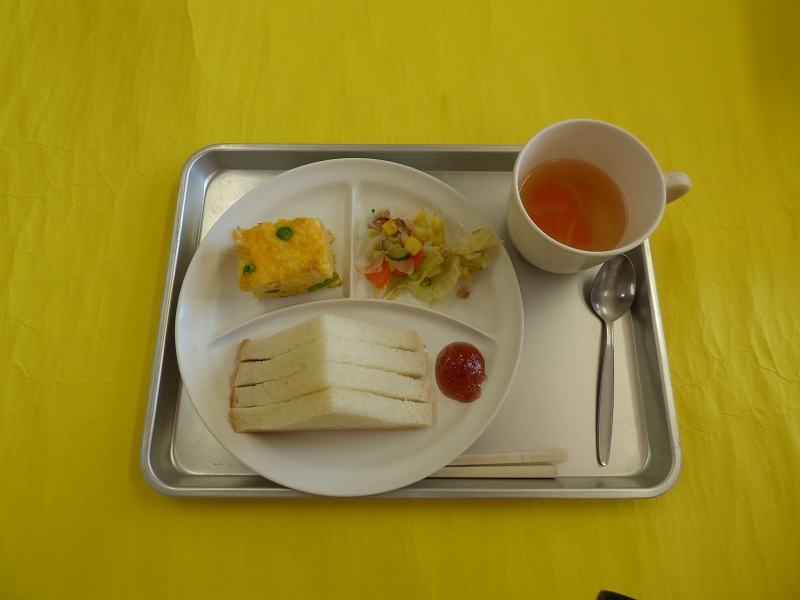 ・食パン・いちごジャム・チーズオムレツ・茹でキャベツのサラダ・ポトフ・・・エネルギー 303Kcal / たんぱく質 15.2g