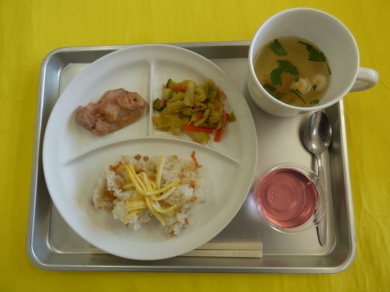 ・ちらし寿司・鶏のみそマヨ焼き・和風サラダ・麩のすまし汁・いちごゼリー・・・エネルギー 383Kcal / たんぱく質 14.2g