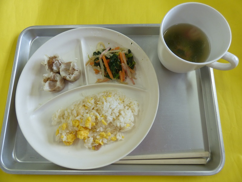・五目炒飯、焼売、ほうれん草のナムル、なるとのスープ・・・エネルギー 322Kcal / たんぱく質 10.8g