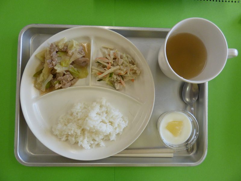 ・ごはん、ニラの中華スープ、回鍋肉、ごぼうのサラダ、杏仁豆腐・・・エネルギー402㎉/タンパク質12.4g