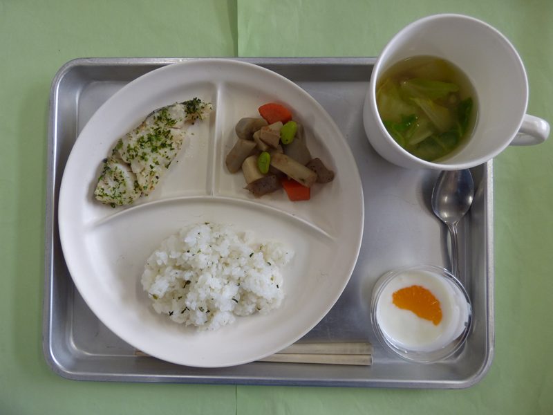 ・なめしごはん、白菜の味噌汁、白身魚の磯辺焼き、筑前煮、ミカンヨーグルト・・・エネルギー344㎉/タンパク質15.6g