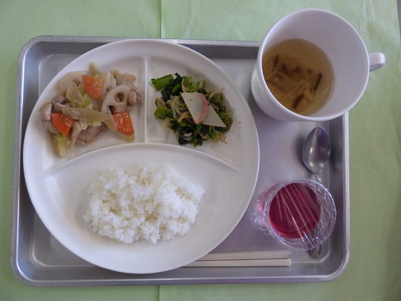 ・ごはん、すまし汁、鶏肉と根菜の味噌炒め、小松菜とかまぼこのおかか和え、ぶどうゼリー・・・エネルギー354㎉/タンパク質14.4g