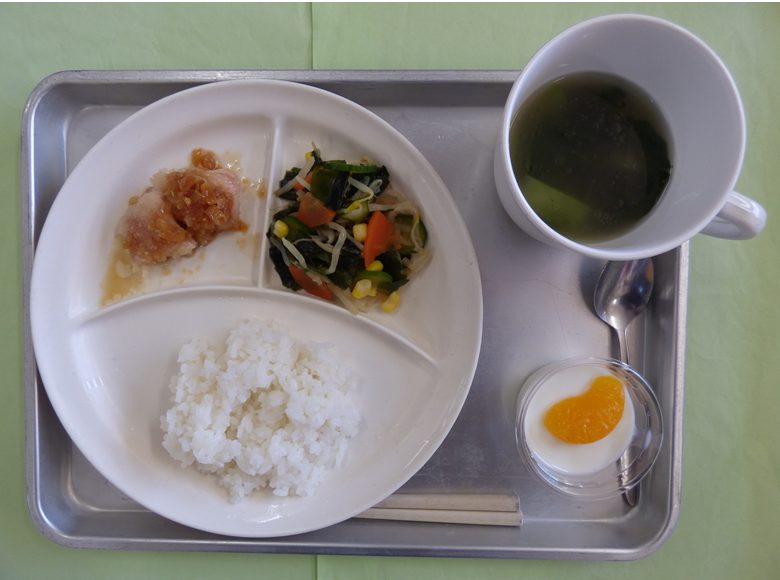 ・ごはん、チンゲン菜のスープ、揚げ鶏の甘酢ねぎソース、中華風わかめサラダ、ミルク寒天・・・エネルギー390㎉/タンパク質12.6g