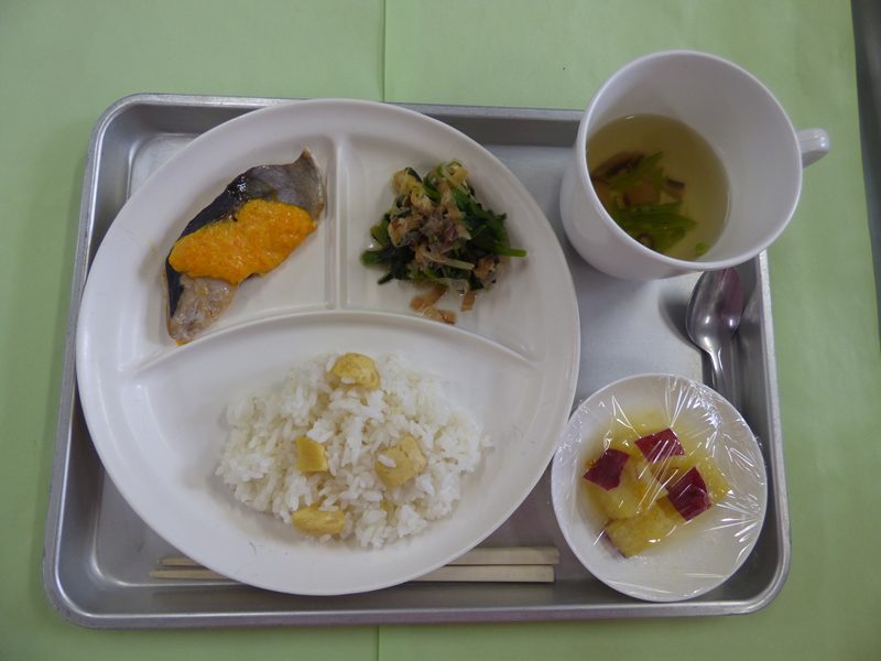 ・栗ご飯、絹さやのすまし汁、あじのもみじ焼き、ほうれん草ときのこのお浸し、さつまいものマーマレード焼き・・・エネルギー364㎉/タンパク質15.1g