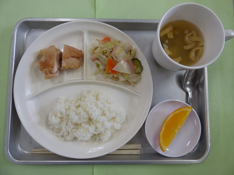 ・ごはん、わかめの味噌汁、鶏肉の竜田揚げ、かまぼこサラダ、オレンジ・・・エネルギー390㎉/タンパク質13.6g