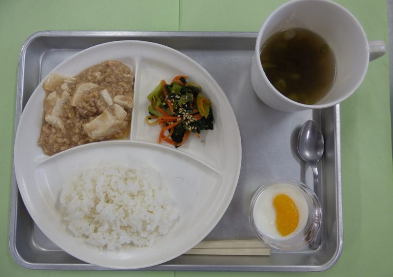 ・ごはん、もずくの中華スープ、麻婆豆腐、チンゲン菜の中華和え、杏仁豆腐・・・エネルギー320㎉/タンパク質11.0g