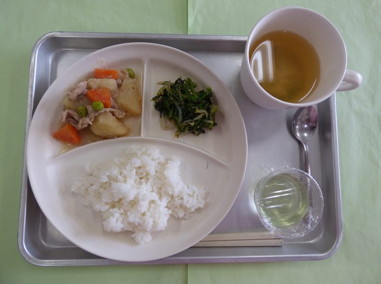 ・ごはん、大根の味噌汁、肉じゃが、ほうれん草の胡麻和え、青りんごゼリー・・・エネルギー380㎉/タンパク質13.5g