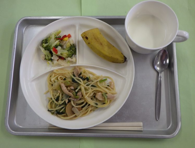 ・鶏肉と小松菜の和風スパゲッティ、ミルク、ミックスサラダ、バナナ・・・エネルギー422㎉/タンパク質18.4g