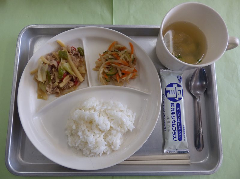 ・ごはん、豆腐の中華スープ、チンジャオロース、もやしの中華風和え物、カルシウムウエハース・・・エネルギー310㎉/タンパク質11.2g
