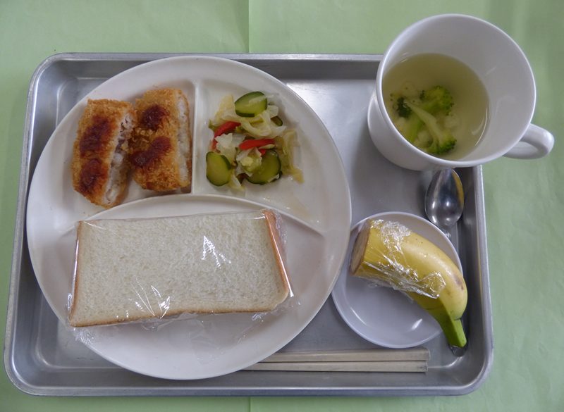 ・いちごジャムサンド、花野菜のスープ、白身のフライ、キャベツとパプリカのマリネ、バナナ・・・エネルギー375㎉/タンパク質16.9g