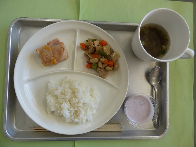 ・ごはん、もずくの味噌汁、鶏肉のマーマレード焼き、五目煮、ブルーベリーヨーグルト・・・エネルギー390㎉/タンパク質15.0g