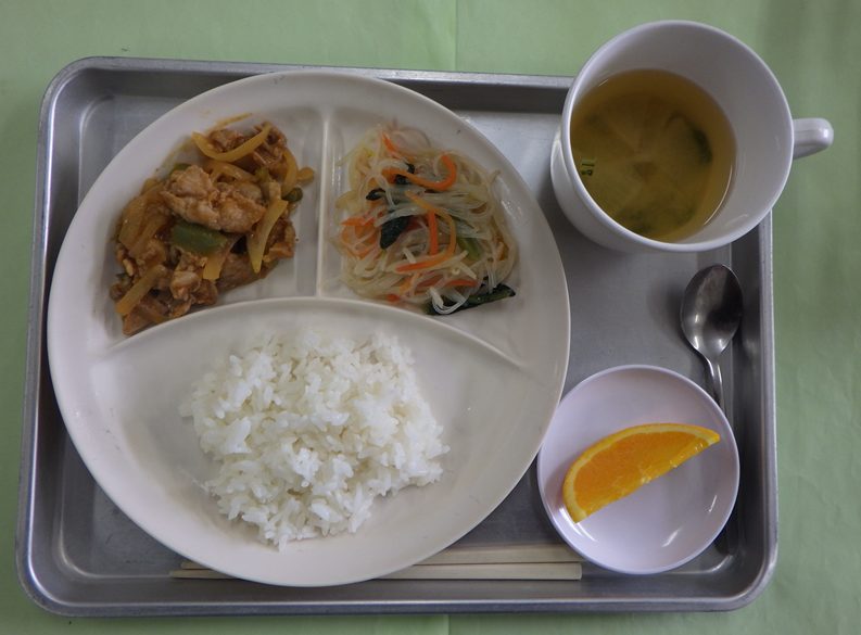 ・ごはん、大根の味噌汁、ポークチャップ、和風春雨サラダ、オレンジ・・・エネルギー377㎉/タンパク質12.6g