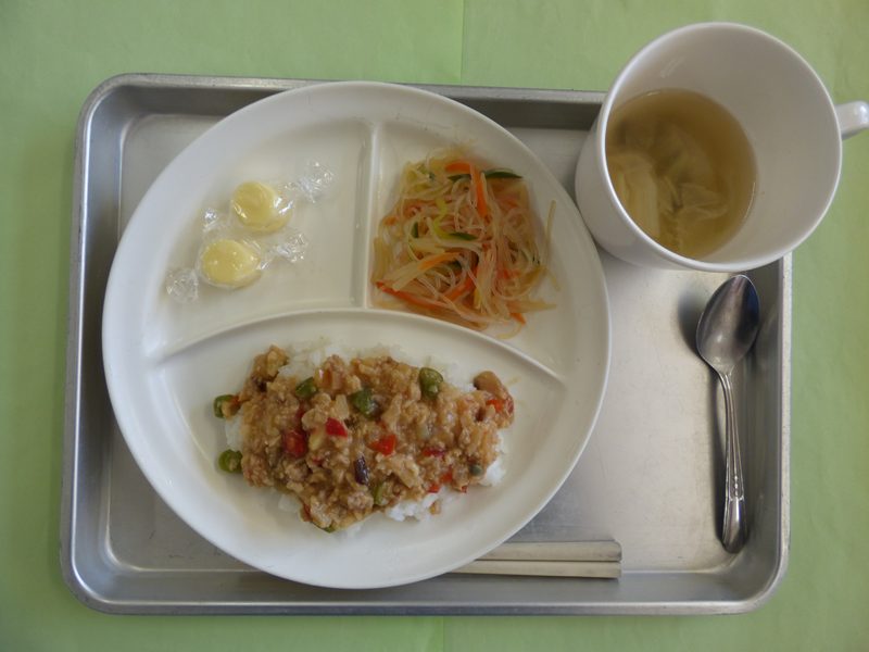 ・ジャージャー丼、白菜の中華スープ、中華風春雨サラダ、キャンディーチーズ・・・エネルギー326㎉/タンパク質11.4g