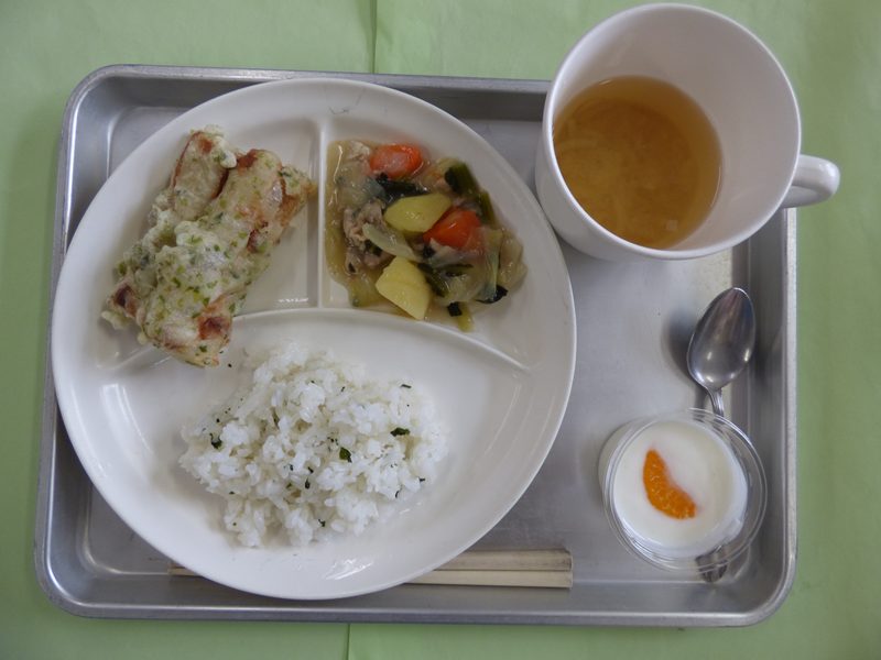 ・わかめごはん、もやしの味噌汁、竹輪の磯辺揚げ、野菜の和風煮、みかんヨーグルト・・・エネルギー434㎉/タンパク質12.9g