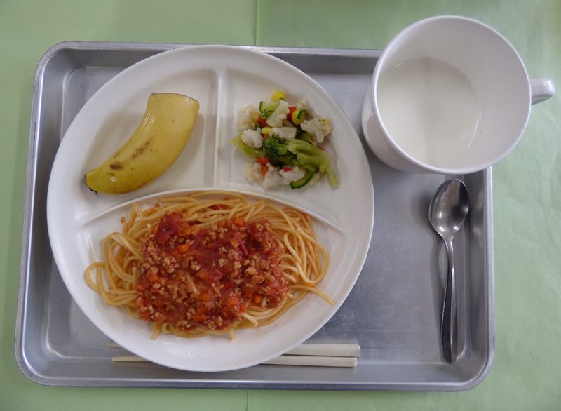 ・スパゲッティミートソース、ミルク、野菜サラダ、バナナ・・・エネルギー361㎉/タンパク質14.0g