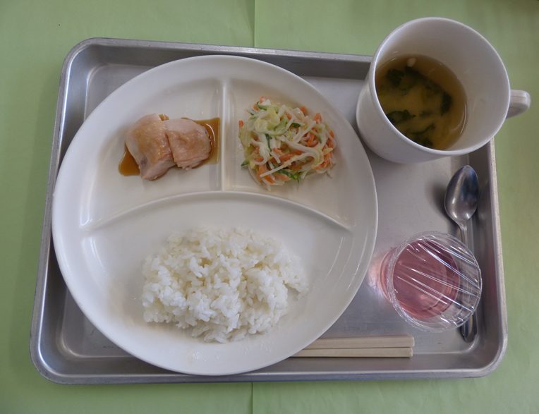 ・ごはん、小松菜の味噌汁、鶏肉の照り焼き、そうめんサラダ、いちごゼリー・・・エネルギー344㎉/タンパク質12.9g