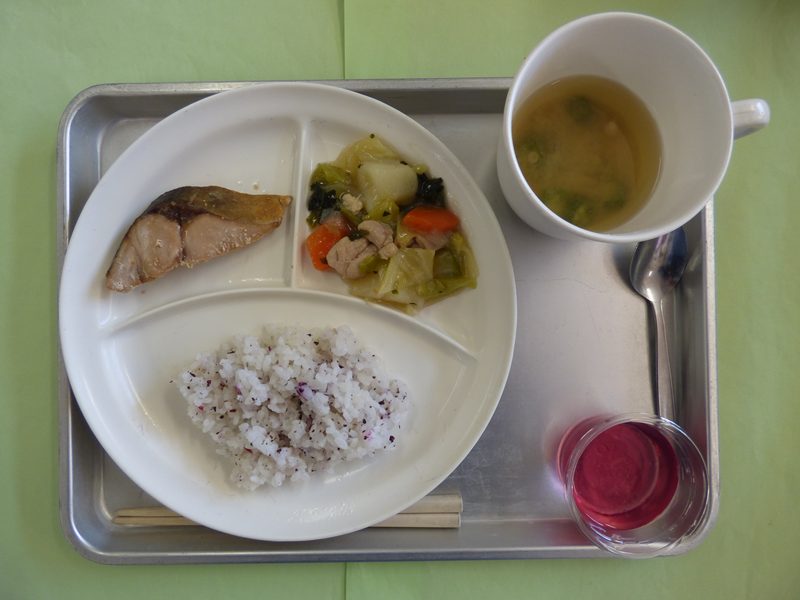 ・ゆかりごはん、オクラの味噌汁、あじのみりん焼き、野菜の和風煮、ぶどうゼリー・・・エネルギー331㎉/タンパク質14.9g