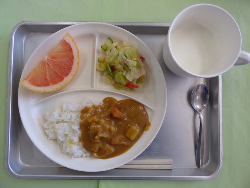 ・チキンカレー、ミルク、カラフルサラダ、ルビーグレープフルーツ・・・エネルギー401㎉/タンパク質13.3g