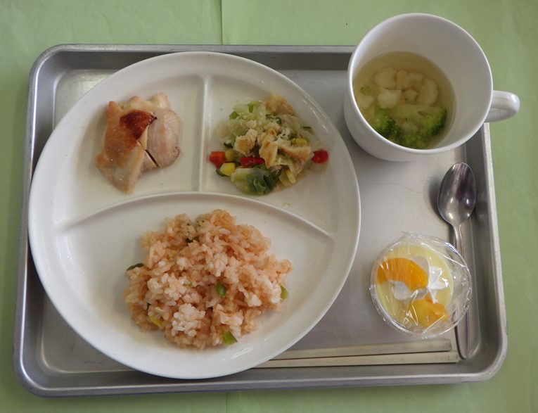 ・ケチャップライス、花野菜スープ、ローストチキン、クラッカーサラダ、プリンアラモード・・・エネルギー401㎉/タンパク質15.7g