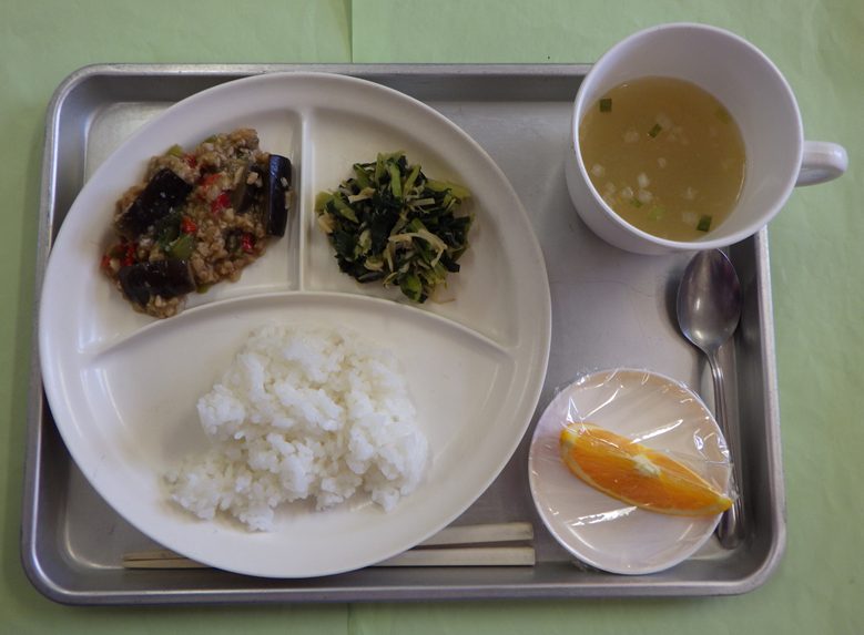 ・ごはん、中華コーンスープ、麻婆なす、小松菜とえのきの中華風和え物、オレンジ・・・エネルギー342㎉/タンパク質12.1g