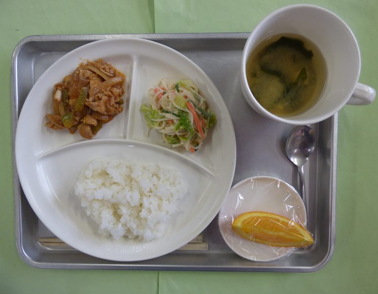 ・ごはん、わかめと豆腐の味噌汁、ポークチャップ、そうめんサラダ、オレンジ・・・エネルギー417㎉/タンパク質14.0g