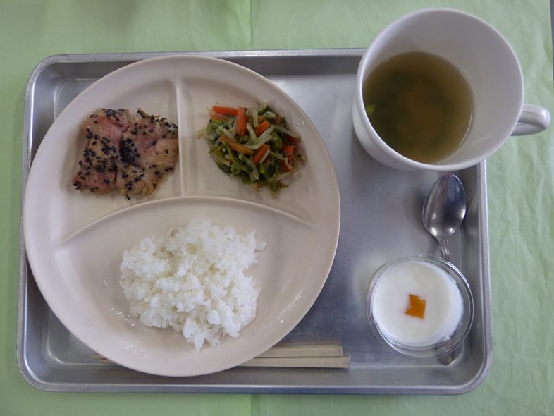 ・ごはん、にらの中華スープ、鶏肉の胡麻揚げ、もやしの中華風和え物、ピーチヨーグルト・・・エネルギー388㎉/タンパク質13.0g