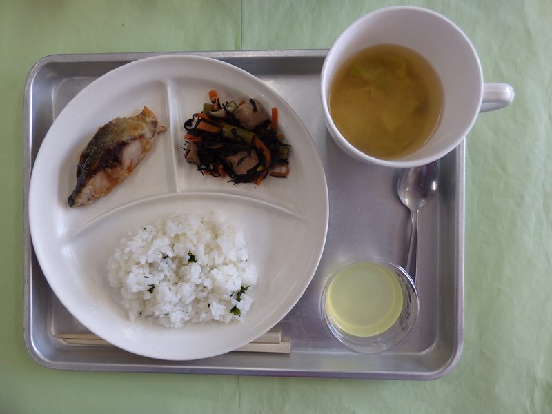 ・わかめごはん、キャベツの味噌汁、あじの蒲焼、高野豆腐とひじきの煮物、グレープフルーツゼリー・・・エネルギー363㎉/タンパク質17.4g