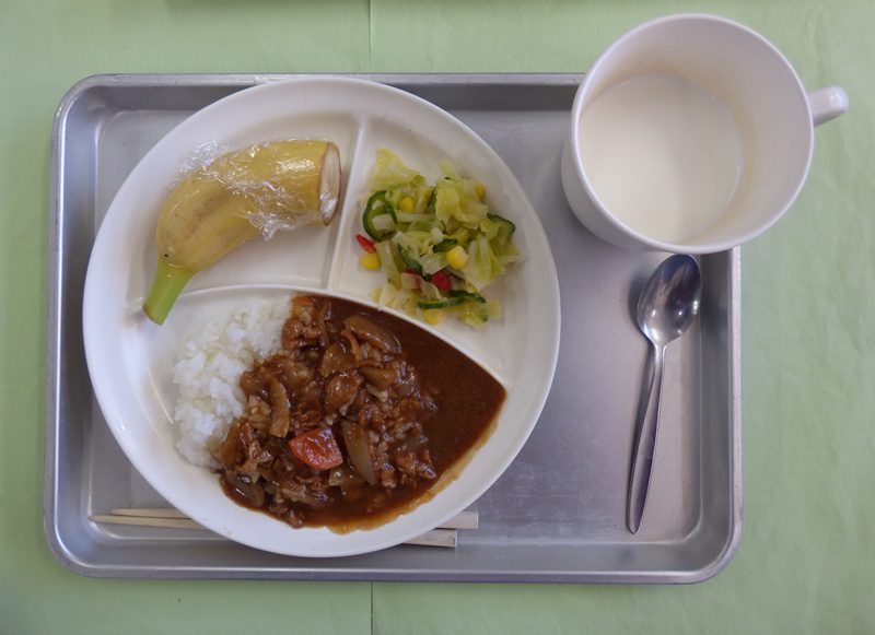 ・ハヤシライス、ミルク、カラフルサラダ、バナナ・・・エネルギー456㎉/タンパク質14.2g