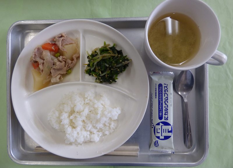 ・ごはん、大根の味噌汁、肉じゃが、野菜の胡麻和え、カルシウムウエハース・・・エネルギー379㎉/タンパク質13.1g
