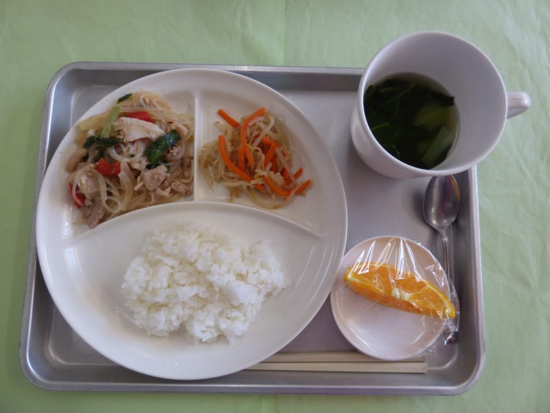 ・ごはん、チンゲン菜の中華スープ、チャプチェ、もやしのナムル、オレンジ・・エネルギー381㎉/タンパク質11.8g