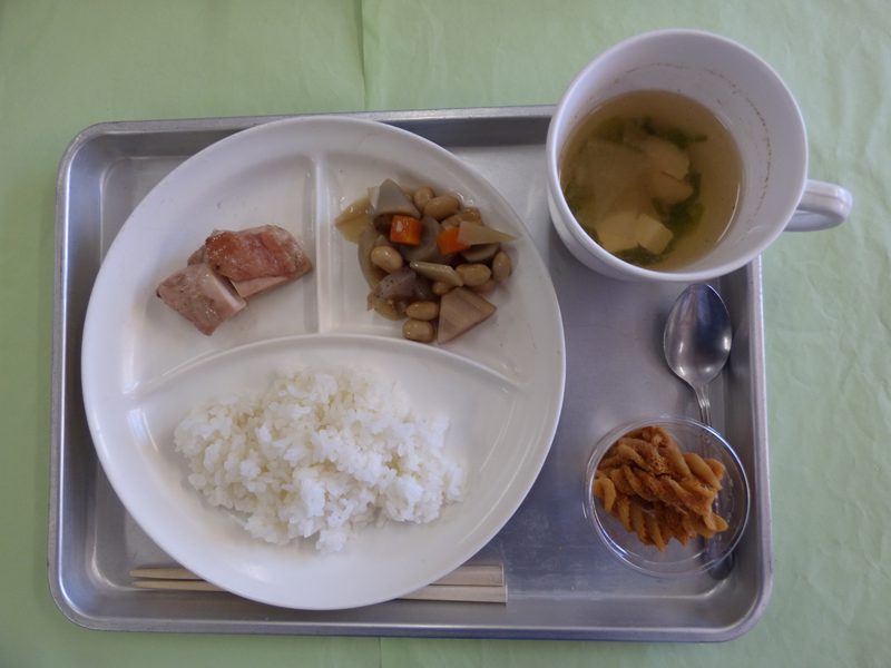 ・ごはん、けんちん汁、鶏肉の梅風味焼き、五目豆、きなこマカロニ・・・エネルギー400㎉/タンパク質15.8g