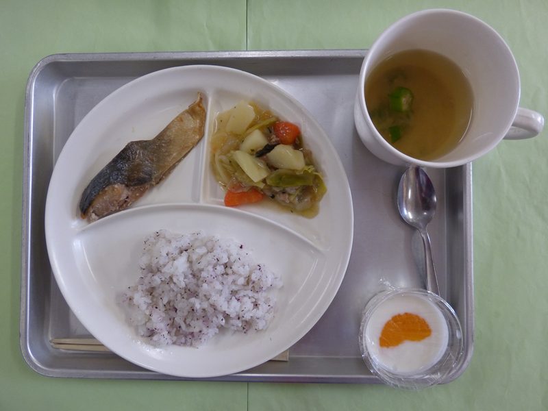 ・ゆかりごはん、オクラの味噌汁、あじのみりん焼き、野菜の和風煮、みかんヨーグルト・・・エネルギー369㎉/タンパク質14.7g