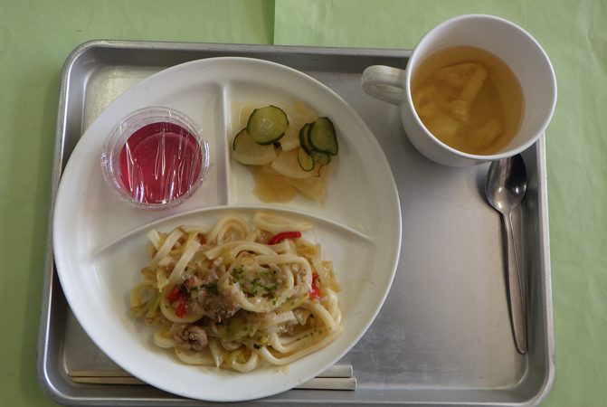 ・焼きうどん、里芋の味噌汁、きゅうりの甘酢漬け、ぶどうゼリー・・・エネルギー359㎉/タンパク質14.1g