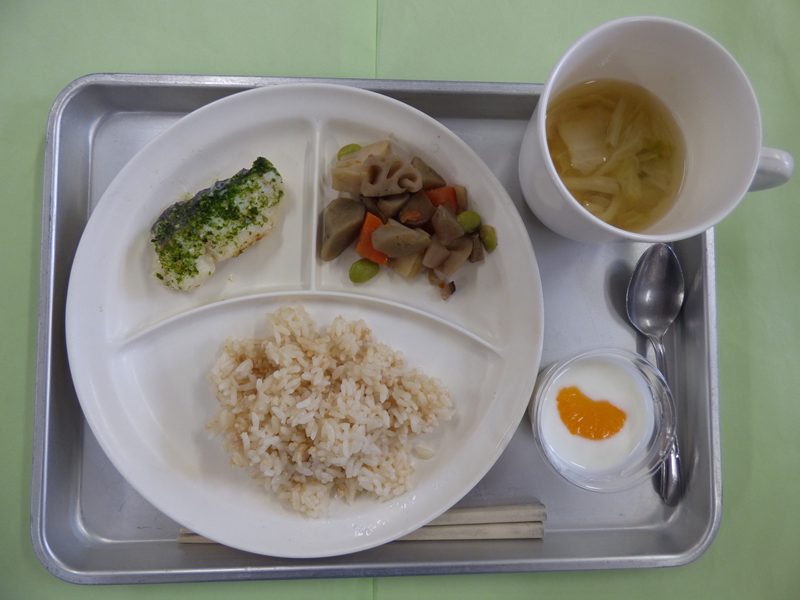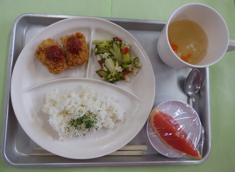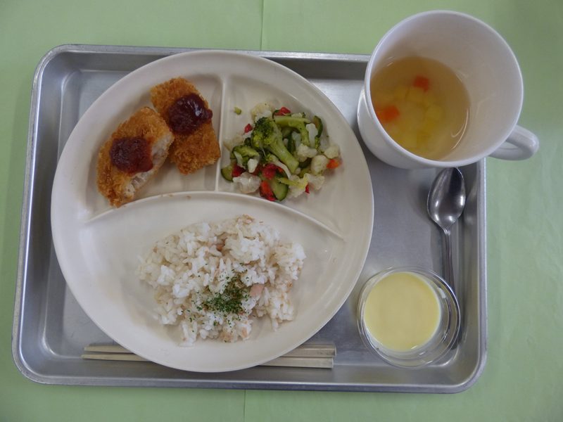 2025.09.25 9月30日(火)~10月3日(金) 写真付き ☆30日 ・シーチキンライス、コンソメスープ、白身のフライ、イタリアンサラダ、カスタードプリン・・・エネルギー366㎉/タンパク質16.2g ☆2日 ・鶏そぼろご飯、白菜の味噌汁、白身魚の磯辺焼き、筑前煮、みかんヨーグルト・・・エネルギー356㎉/タンパク質17.9g ☆3日 ・パセリライス、コンソメスープ、チキンカツ、イタリアンサラダ、ルビーグレープフルーツ・・・エネルギー381㎉/タンパク質13.1g