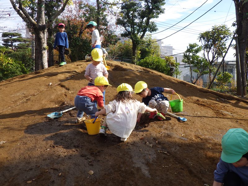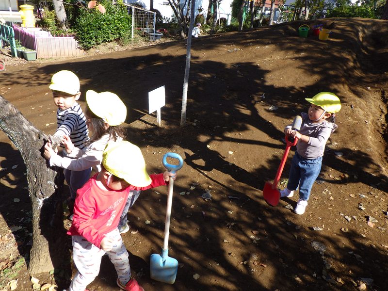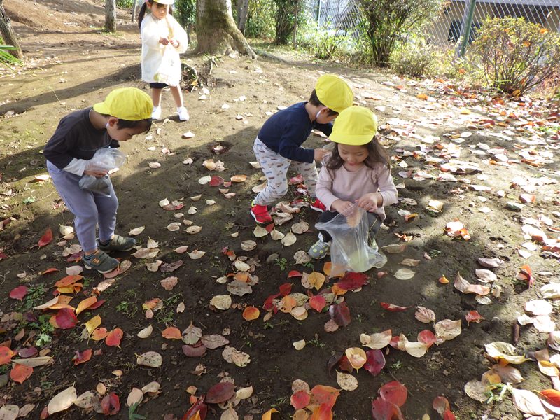 園庭に出ると落ち葉を見つけ「わーい、いろんな色の落ち葉があるー、きれいー!!たくさん集めよう!先生、袋ください。」と袋の中にたくさんの落ち葉を集め、嬉しそうに持ち帰る子ども達でした。