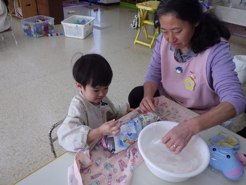 この頃は折り紙に夢中で「先生、鶴を折ってください」「先生、見てピストル折ったんだ」「先生、パックン作ってください」と折ってもらったり、自分で折ったりしながら、遊ぶ姿が見られます。