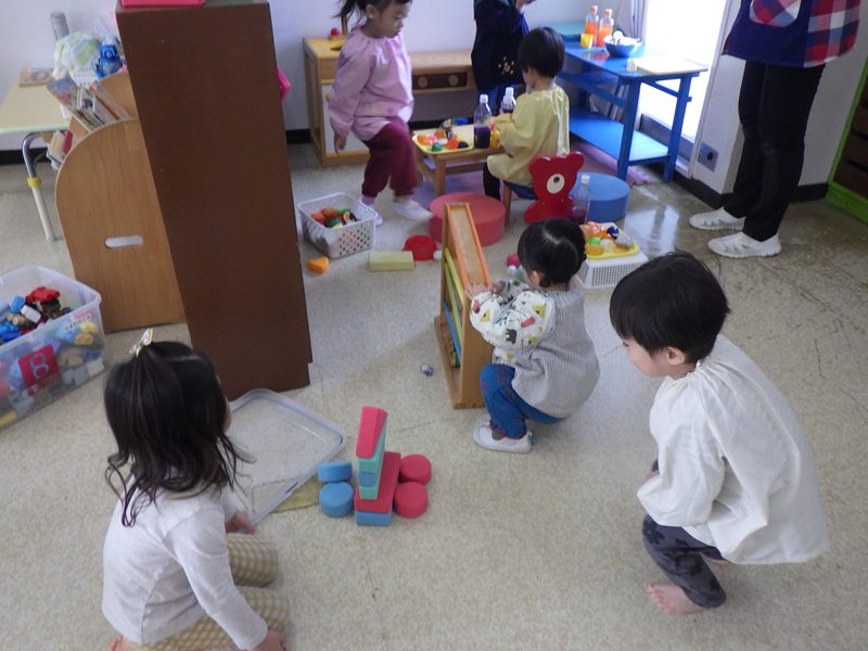 登園してきた子ども達は、どろんこの洋服に着替え「○○くん魚釣りしよう」とお友達を誘ってソフト積木やままごとセットを使ってごっご遊びをしています。